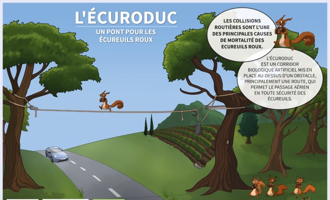 L’écuroduc en ville est donc un système permettant aux écureuils de franchir les routes ou de circuler “en toute sécurité” sur une corde d’un diamètre leur permettant de se déplacer avec aisance, et située en hauteur.